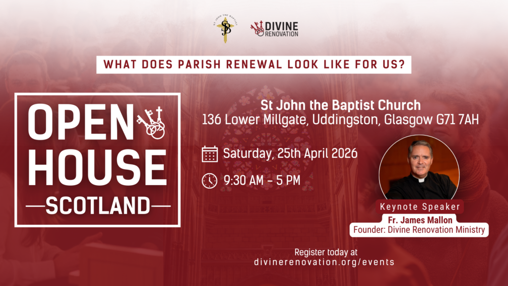 Imagine what your parish would look like if it started to attract new people, made new disciples and grew in numbers and faith. Is growth and new life in our Catholic parishes even possible? Here at Divine Renovation we see this happen in parishes around the UK. The St John the Baptist Parish invites you to DR Open House Scotland, featuring Fr. James Mallon as keynote speaker, a chance to get inspired by priests and parishioners as they share stories of transformation. Hear their learnings and dream about the change that could happen in your own parish. If you need fresh inspiration and encouragement, this event is for you.